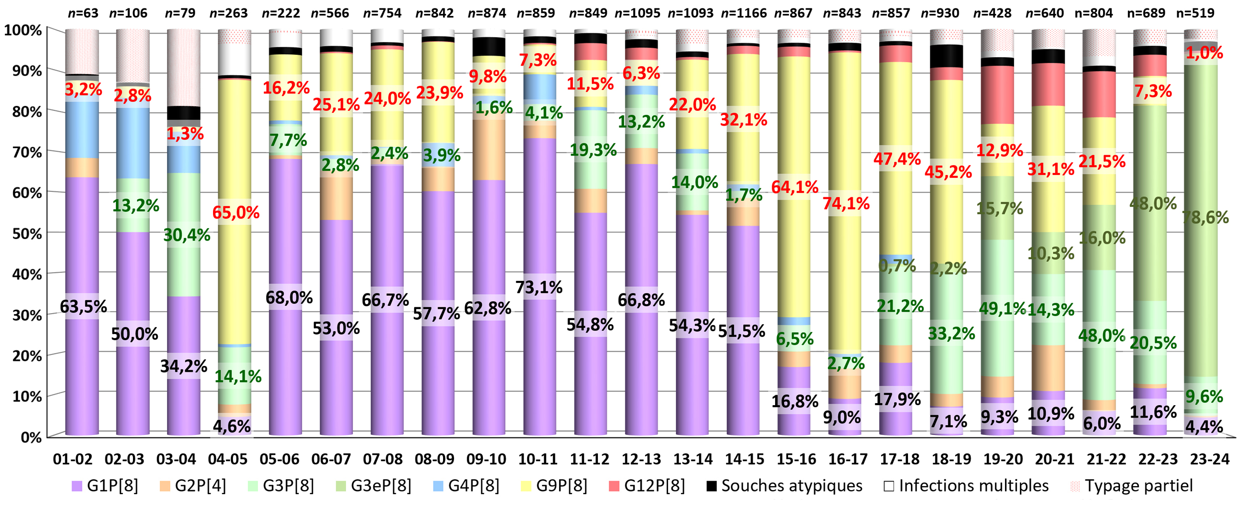 Ainsi, les six combinaisons génotypiques désormais classiques (G1/G3-G3e/G4/G9/G12P[8] et G2P[4]) représentaient 96,4% des souches caractérisées. Les génotypes ou combinaisons atypiques (incluant notamment quelques associations de génotypes G et P classiques) représentent 2,1 % et les infections mixtes 1,5%.
